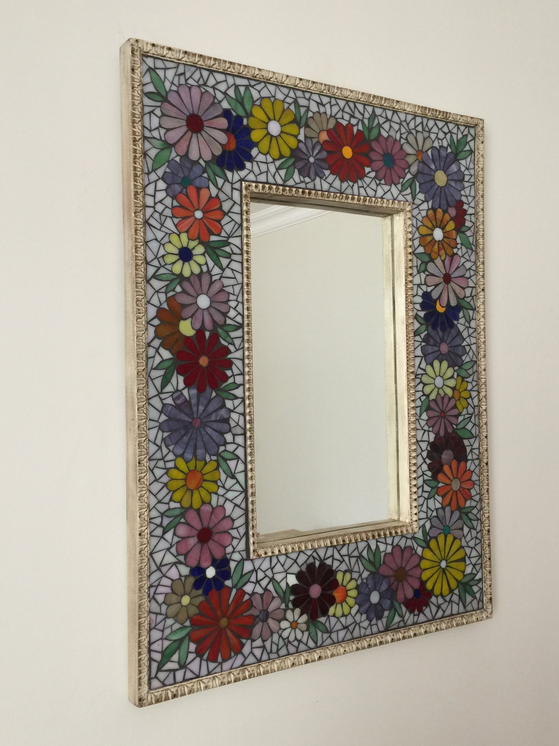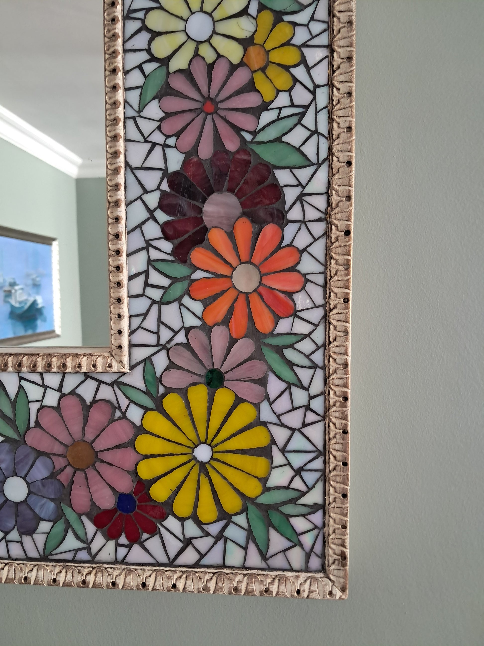 Bu özel tasarım ayna, üzerinde özenle işlenmiş çiçek motifleri ve ışıltılı sedefli cam parçalarıyla büyüleyici bir görünüme kavuşuyor.Işığın her yansımasında farklı bir renk oyununa sahne olan mozaikler, mekanınıza hem sanatsal bir dokunuş hem de eşsiz bir estetik katıyor.