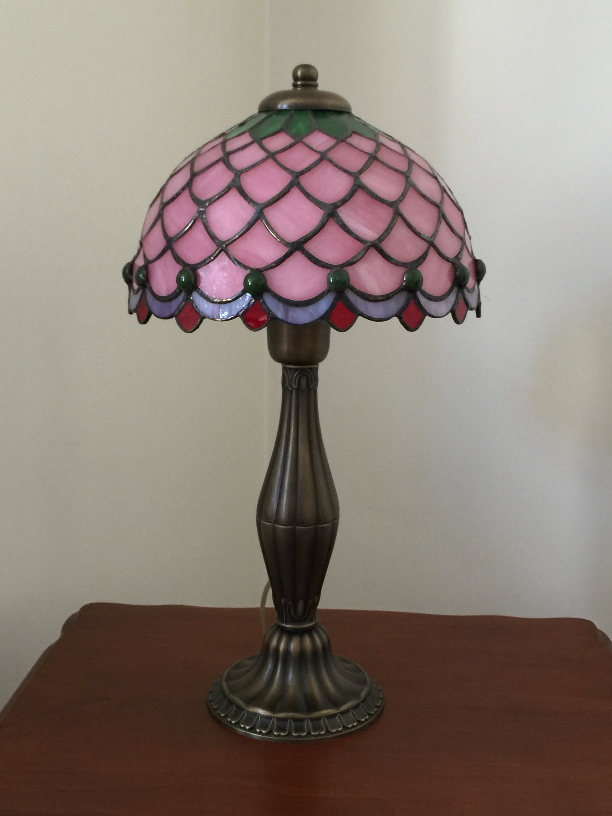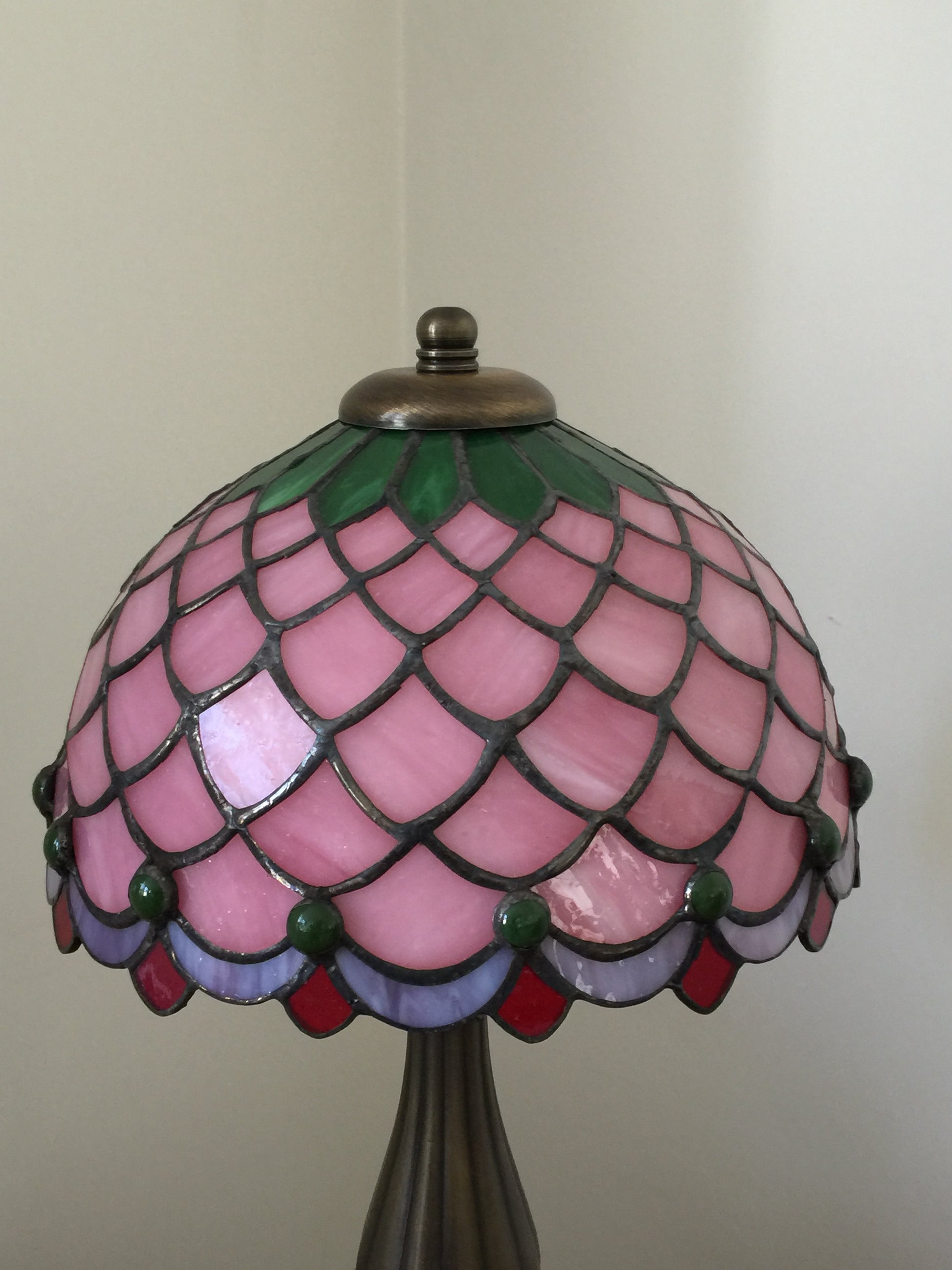 Balık pulu desenleriyle işlenen bu vitray lamba, pembe tonların zarif yansımalarıyla mekana masalsı bir hava katıyor.El işçiliğiyle hazırlanmış cam parçaları, ışıkla buluştuğunda tıpkı suyun yüzeyinde dalgaların kırılması gibi büyüleyici bir parıltı oluşturuyor.