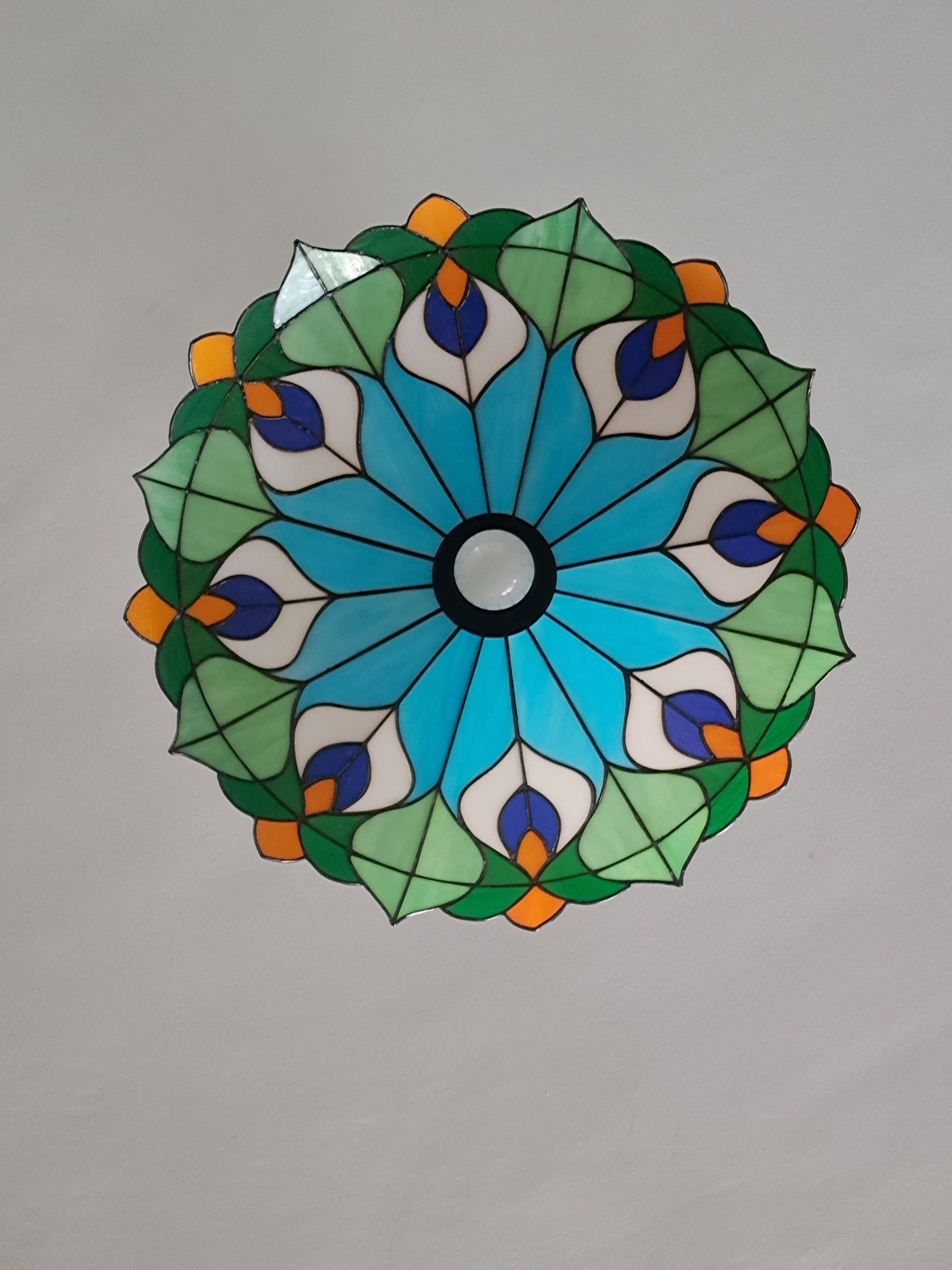 Mavi, turuncu ve yeşilin büyüleyici uyumuyla tasarlanan vitray lamba , ışığı sanata dönüştürüyor.El işçiliğiyle hazırlanmış bu özel tasarım, bulunduğu ortama hem sıcaklık hem de göz alıcı bir zarafet katıyor.