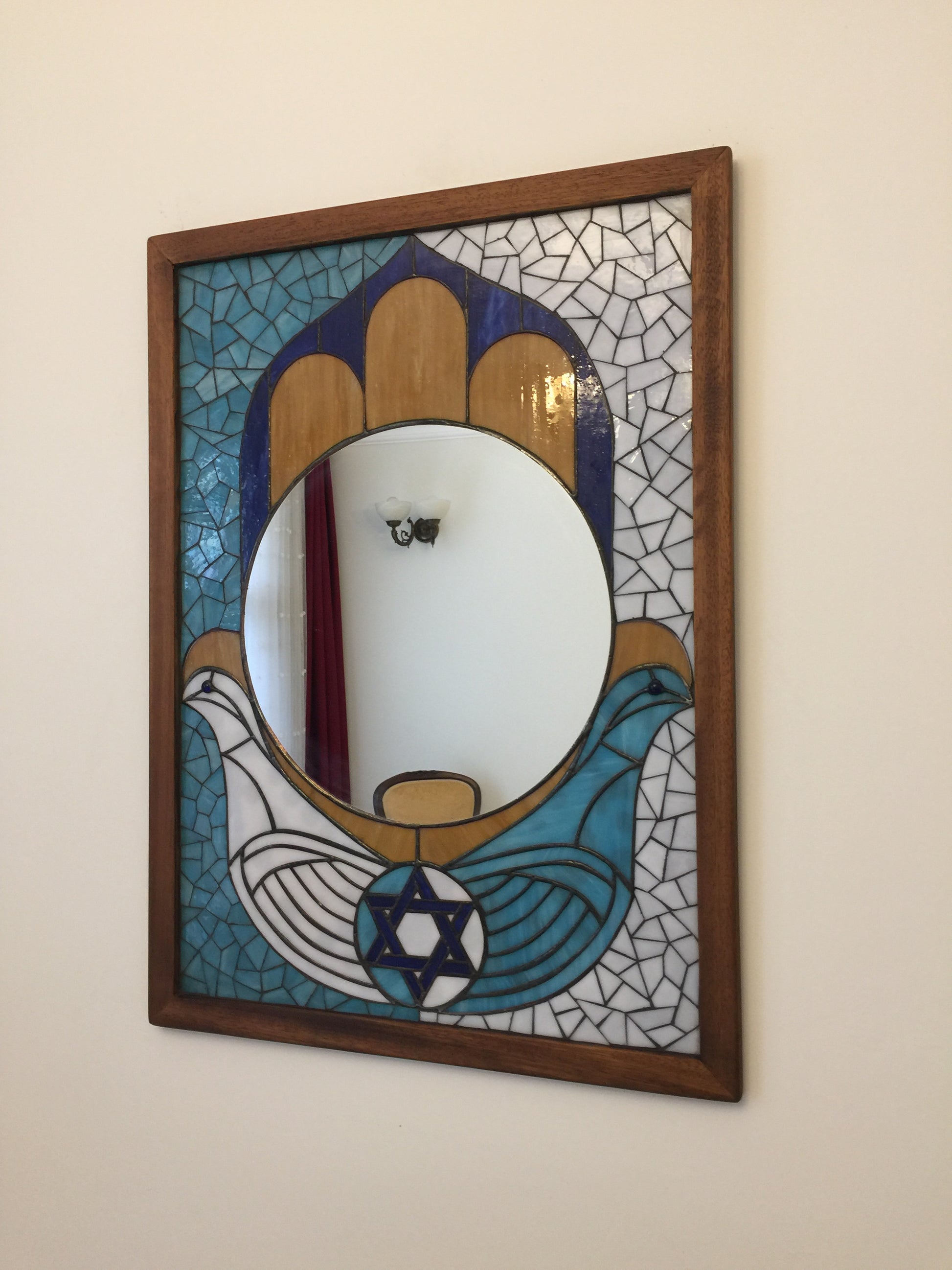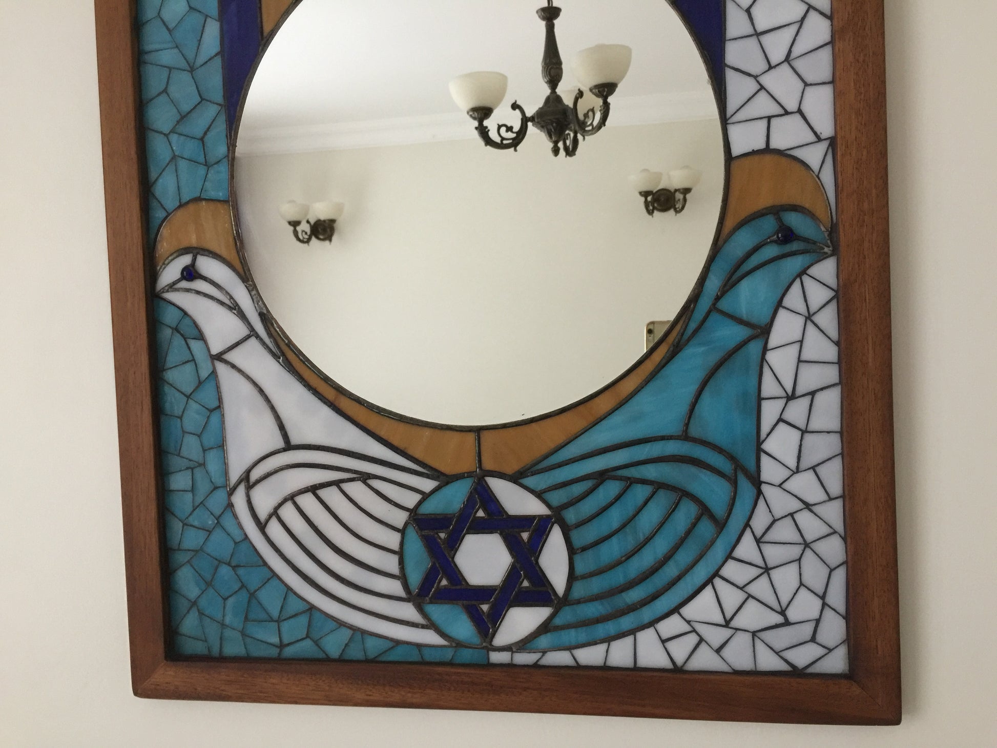 Güvercinin zarif duruşu ile Selçuklu yıldızının güçlü simgeselliğini buluşturan bu özel tasarımmozaik-vitray ayna, yaşam alanlarınıza hem estetik hem de derin bir anlam katıyor.